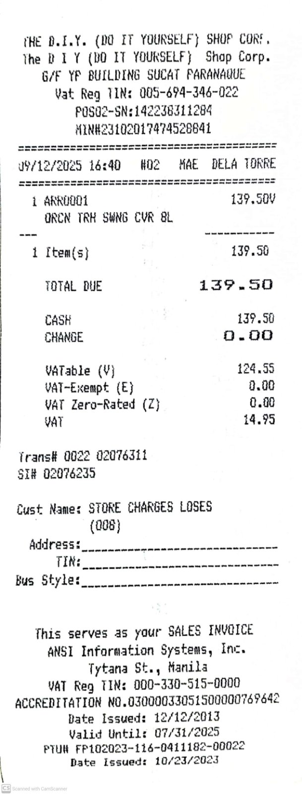 | ARR0001 | OROCN TRSH CN W SWNG CVR P B G Y 8L REG | -1.00 | ₱139.50 | Added to Charge List (Control: 20250903-22) - ANSI=1 / ACTUAL = 0 = 1 LOSS | EDWIN CADALIN | 2025-09-09 12:57:14 | Settled |